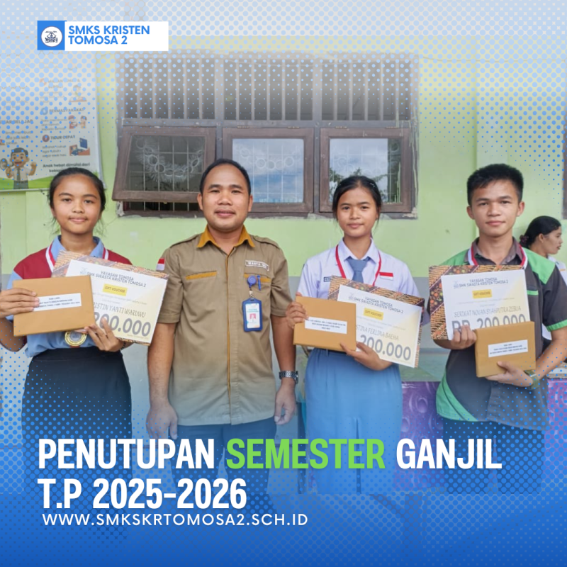 SMKS Kristen Tomosa 2 secara resmi menutup kegiatan pembelajaran Semester I Tahun Ajaran 2025–2026 melalui sebuah kegiatan sederhana namun penuh makna yang dilaksanakan di lingkungan sekolah. Kegiatan ini menjadi momentum refleksi atas proses pembelajaran selama satu semester sekaligus wujud apresiasi sekolah terhadap kerja keras, disiplin, dan prestasi para peserta didik.